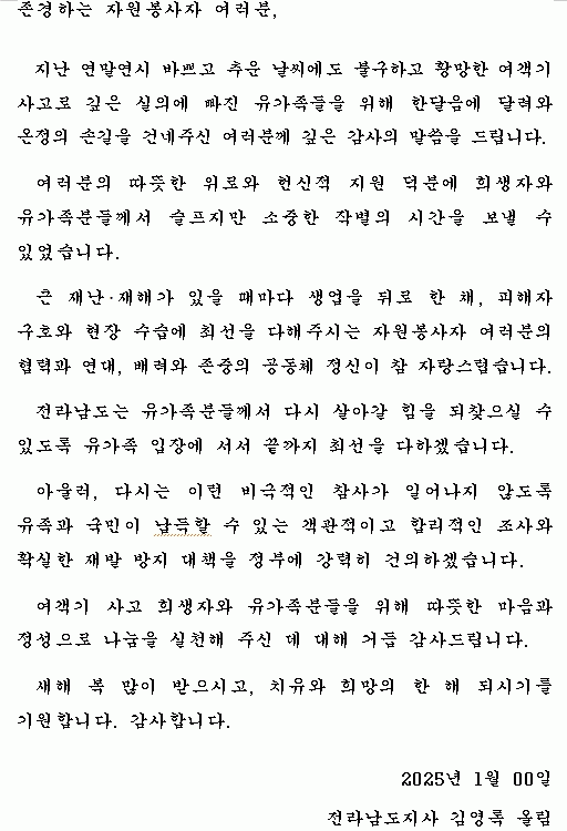 김영록 지사는 서한문을 통해 “참사의 아픔 속에서도 자원봉사자의 헌신과 따뜻한 손길 덕분에 피해자와 유가족이 슬프지만 소중한 작별의 시간을 보낼 수 있었다”며 “전남도를 대표해 깊은 감사의 마음을 전한다”고 밝혔다.