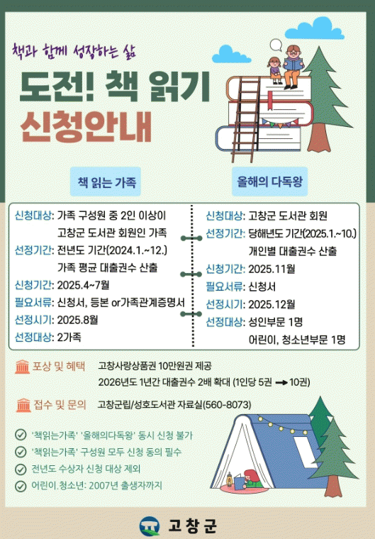 ‘올해의 다독왕’과 ‘책 읽는 가족’으로 선발된 사람에게는 고창사랑상품권 10만원권과 1년간 도서대출 권수 2배(5권→10권) 혜택이 주어진다.