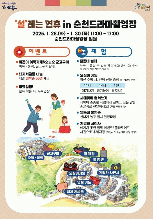 또한, 설 명절을 맞아, 소중한 사람에게 전하고 싶은 말을 손글씨로 전할 수 있는 ‘새해맞이 엽서쓰기’, 액티비티 체험으로 ‘달동네 썰매’, 촬영장을 배경으로 깜짝 폴라로이드 사진을 찍어주는 ‘게릴라 사진사’, 최근 흥행한 OTT 프로그램인 오징어게임을 모티브한 ‘오징어게임 in 드라마촬영장’ 등의 색다른 이벤트도 진행한다.