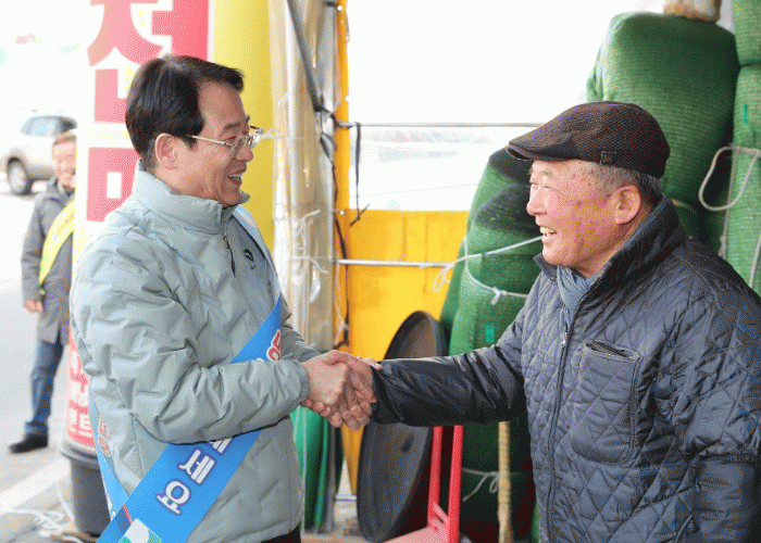 강진원 강진군수가 설 명절을 앞두고 23일 강진상가를 일일이 방문, 손을 맞잡으며 지역 내 소상공인들과 경기 불황 의지를 다졌다.