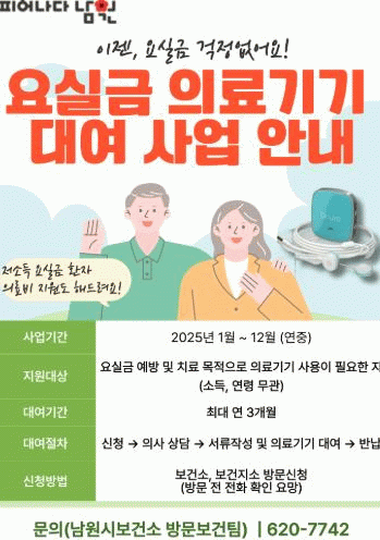 의료기기 대여를 희망하는 사람은 신분증을 지참해 남원시 보건소와 면지역 보건지소를 방문해 신청할 수 있다.