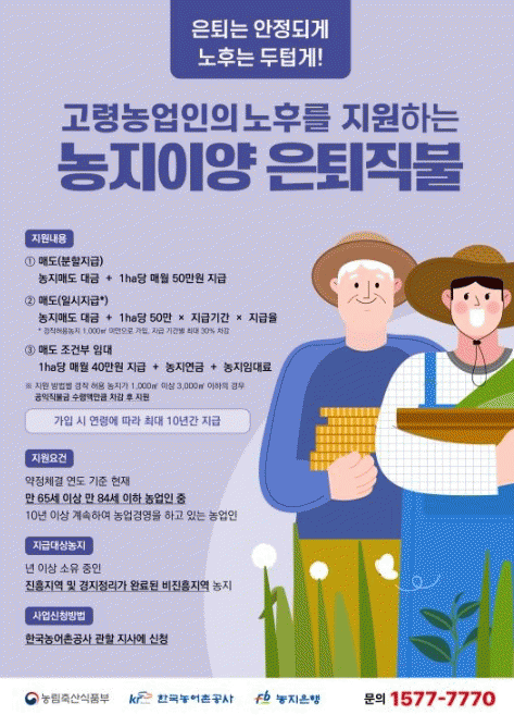 농지이양은퇴직불사업은 고령농업인(만 65~84세)이 농지를 매도하고 농업은퇴를 할 때 매월 일정 금액의 직불금을 지급하는 사업이다.