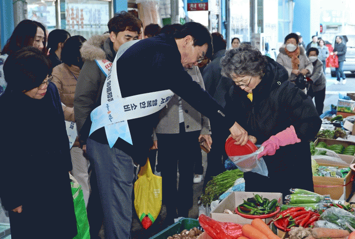 공무원과 토요시장 상인회, 지역주민 등 300여명은 지역경제회복을 위한 퍼포먼스와 함께 설맞이 제수용품과 지역의 다양한 농·축·수산물을 구입하며 민생경제 살리기에 힘을 보탰다.