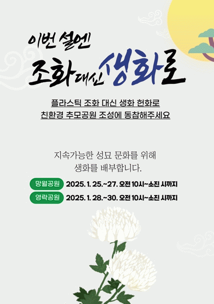 광주광역시와 광주도시공사는 설 명절 기간 망월묘지공원과 영락공원에서 생화를 배부하며 ‘플라스틱조화 없는 친환경 추모공원 캠페인’을 추진한다.