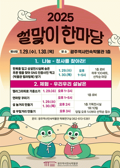 임찬혁 광주역사민속박물관장은 “시민들에게 푸른 뱀이 상징하는 새로운 도전과 성장 에너지를 선사할 수 있도록 다양한 나눔‧체험 프로그램을 준비했다”며 “설 연휴 박물관 나들이를 통해 희망을 채워가는 시간이 되기를 바란다”고 말했다.