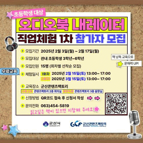 이번 체험교육은 ‘오디오북 내레이터 직업체험’으로 1차 교육은 오는 2월 15일과 3월 15일, 총 2회차로 운영한다.