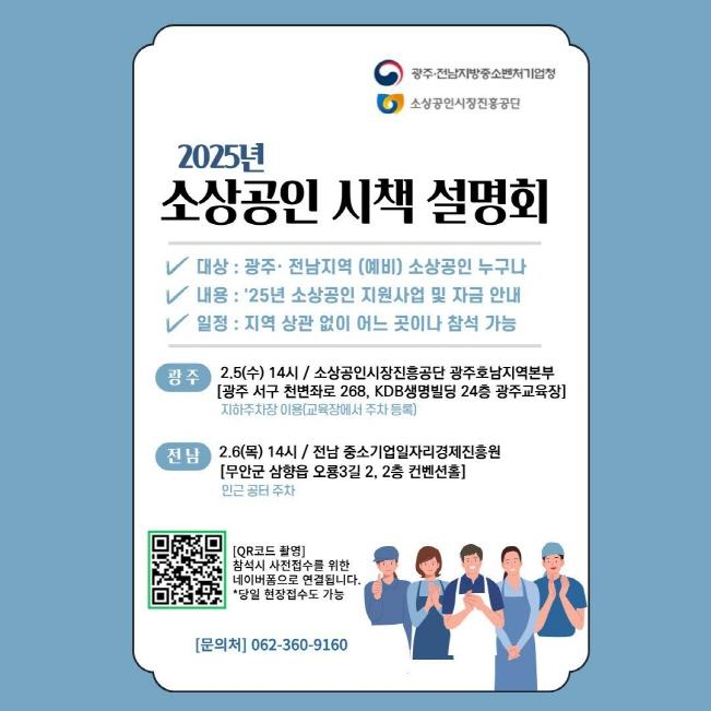설명회 참석을 원하는 소상공인은 2월 4일까지 사전접수(네이버폼 QR코드(form.naver.com/response/TfZGULI7QD8bnK9gaBGiNg))하거나 당일 현장접수를 통해서 참석이 가능하며 자세한 내용은 광주전남중기청 홈페이지(https://www.mss.go.kr/site/gwangju)를 통해 확인 할 수 있다.