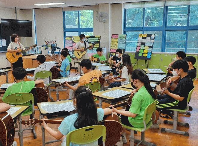 ‘통기타 행복교실’은 2019년 4개교 6학급 97명을 대상으로 시범운영을 시작해 지난해 10개교 28학급 576명이 참여하며 그 규모가 확장하고 있다.