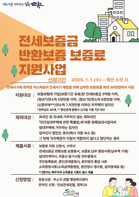 지원 대상은 순천시 거주 ▲신청일 기준 보증 효력이 유효한 전세보증금반환보증에 가입한 임차보증금 3억원 이하 ▲ 연소득 기준 청년 5천만원 이하, 청년 외 6천만원 이하, 신혼부부 7천5백만원 이하 무주택 임차인이다. 신청은 주소지 관할 읍면동 행정복지센터를 방문해 신청하면 된다.