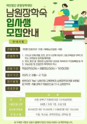 신청 기간은 2025년 2월 3일부터 2월 7일까지이며, 남원시청 교육체육과나 남원장학숙으로 방문하여 접수하거나 등기우편으로 신청할 수 있다.
