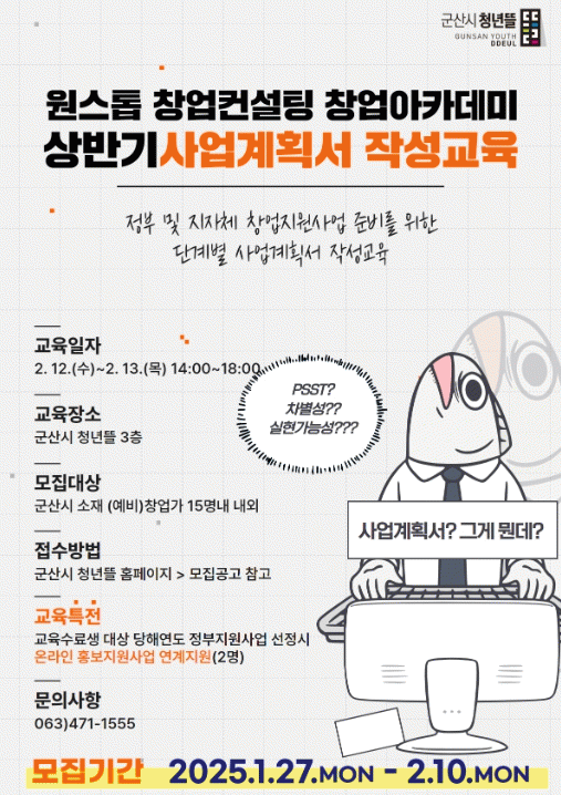 교육생 모집 기간은 1월 27일부터 2월 10일까지로 모집 인원은 15명이다. 대상은 정부 및 지방자치단체의 창업지원사업을 준비하고 있는 군산시 (예비)창업가들이다. 신청은 군산시 청년뜰 누리집에서 접수한다.