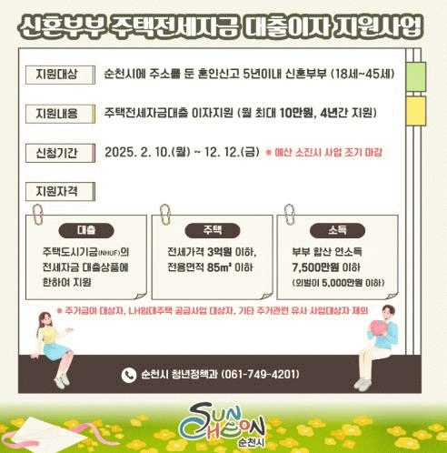 신청 자격은 부부 모두 순천시에 거주하는 18세 이상 45세 이하, 부부 합산 연소득 7,500만 원 이하(외벌이는 5,000만 원 이하), 5년 이내 혼인 신고한 무주택 신혼부부이다.