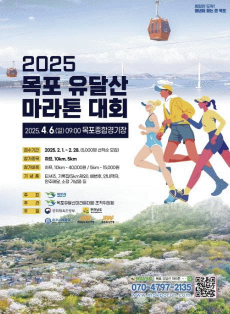 이번 대회는 하프, 10km, 5km의 3개 종목으로 진행되며, 참가 접수는 2월 1일부터 2월 28일까지 선착순 5,000명을 모집한다. 참가비는 ▲하프와 10km는 4만원, ▲5km는 1만 5천원이며, 5km에 참가하는 목포거주 초중고 학생은 5천원이다.
