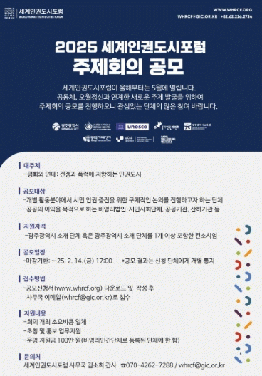 광주시는 포럼 개최에 앞서 오는 2월14일까지 2025 세계인권도시포럼의 주제회의를 주관할 단체를 공개 모집한다.