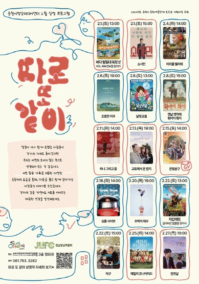 상영 일정은 순천시영상미디어센터 누리집에서 확인할 수 있으며 모든 상영회는 무료로 관람할 수 있다.