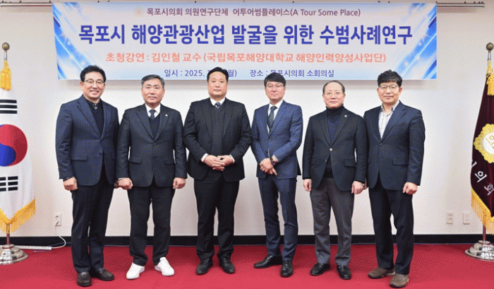 목포시의회는 ‘관광인프라 시설개선 및 활성화 방안 연구’를 설립목적으로 한 의원연구모임 ‘어투어썸플레이스(A Tour Some Place)’를 3일 발족시켰다. 이날 시의회 소회의실에서 목포해양대 해양인력양성사업단 김인철 교수를 초청 ‘향후 연구과제 설정과 일정’ 등을 논의하고 ‘목포시 해양관광산업 발굴을 위한 수범사례연구’를 주제로 한 특강을 실시했다.