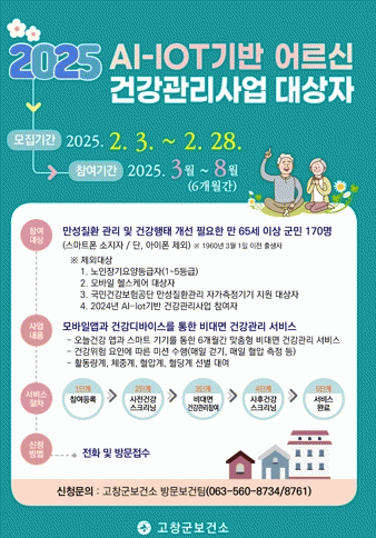 유병수 고창군보건소장은 “스마트기술을 활용하여 어르신이 건강한 생활습관을 형성하고 만성질환을 관리할 수 있는 자가건강관리 역량을 향상시켜 건강한 노후를 즐길 수 있도록 최선을 다하겠다”고 말했다.