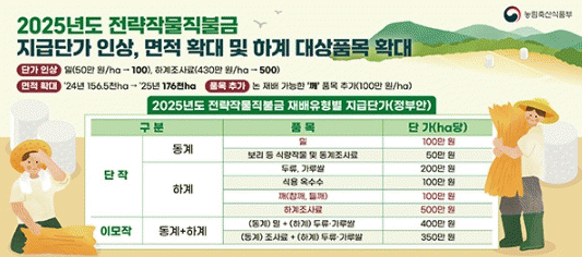 올해 달라진 점은 하계작물로 깨(들깨, 참깨)가 새롭게 추가됐고, 밀(동계)의 직불금 단가가 기존 50만원에서 100만원으로, 조사료(하계)는 430만원에서 500만원으로 인상됐다.