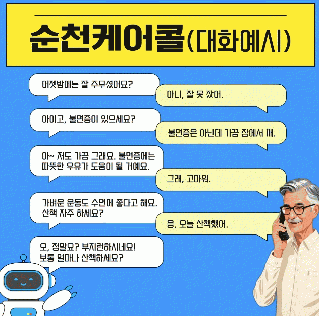‘순천 케어콜’은 대화형 인공지능 기술을 활용해 AI가 마치 실제 상담원처럼 매주 돌봄 대상자에게 전화를 걸어 안부를 묻고 말벗이 되어주는 사업이다.