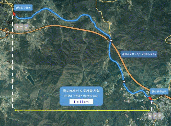 국도26호선 장수 천천-진안 진안간 도로개량사업은 현재 급커브와 급경사 등 선형불량 구간이 많아 안전성이 크게 떨어지는 2차선 도로다.