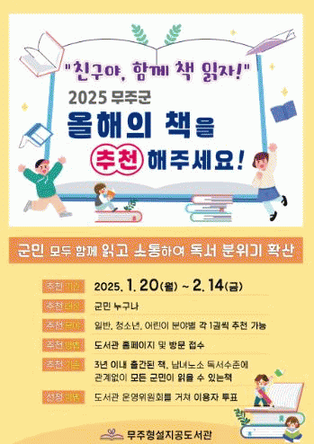 ‘친구야, 함께 책 읽자!’는 올해의 책을 함께 선정해 읽고 소통하는 기회의 장을 열겠다는 취지에서 진행하는 것으로, 무주군은 14일까지 무주상상반디숲 누리집 형설지공도서관 바로가기와 직접 방문을 통해 추천을 받는다.