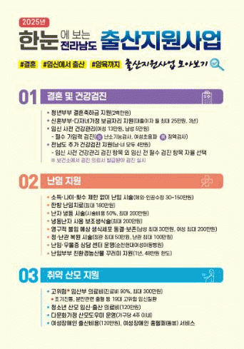 전남도는 도민이 각종 출산 지원정책을 쉽게 찾아 신청하도록 ‘한눈에 보는 출산지원’ 책자를 2월 중 제작·배포하고, 임신·출산·양육 통합 플랫폼을 구축해 올해 하반기에 선보일 예정이다.