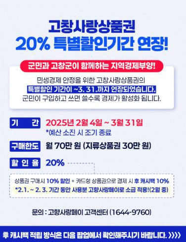 5일 고창군에 따르면 당초 1월말까지였던 ‘고창사랑상품권 20%특별할인’ 혜택을 오는 3월까지 연장 시행한다.