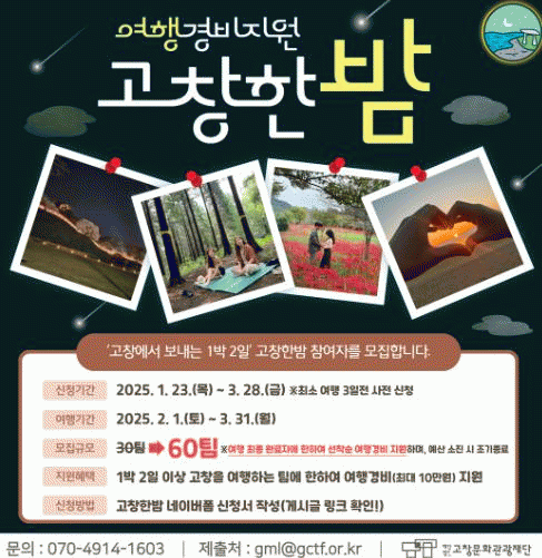 고창을 방문해 다양한 혜택을 누릴 수 있는 ‘고창한밤’ 여행경비 지원사업에 대한 자세한 사항은 고창문화관광재단 공식 홈페이지에서 확인할 수 있다.