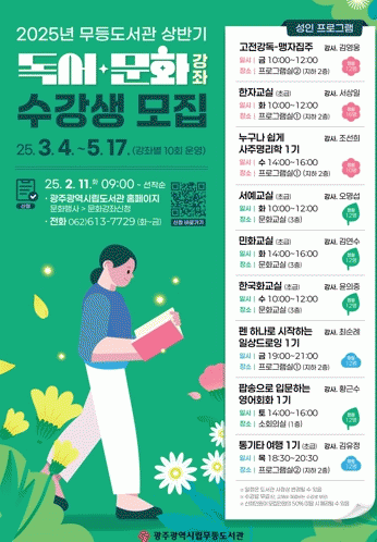 상반기 독서문화 강좌의 수강료는 무료이지만 재료비와 교재비는 수강생이 부담한다. 강좌 수강을 희망하는 시민은 11일부터 광주광역시립도서관 누리집(홈페이지)의 ‘문화강좌신청’란을 통해 접수할 수 있다.