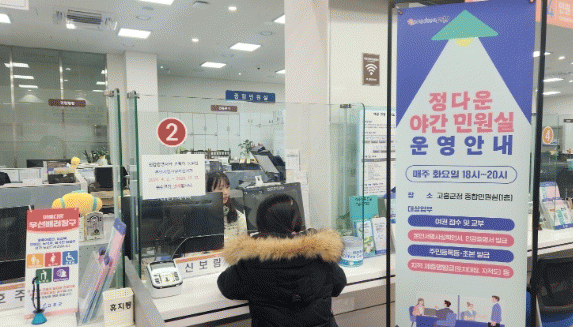 정다운 야간 민원실은 매주 화요일(공휴일은 제외) 오후 6시부터 8시까지 군청 종합민원실(1층)에서 운영되며, 여권, 토지대장, 제증명 서류 등을 신청·교부 받을 수 있다.