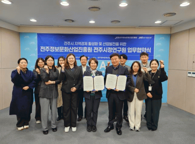 전주정보문화산업진흥원과 전주시정연구원은 5일 진흥원 세미나실에서 허전 원장과 박미자 원장 등 양 기관 관계자들이 참석한 가운데 ‘지역경제 활성화 및 지역산업 발전을 위한 업무협약(MOU)’을 체결했다.