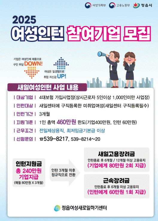 정읍여성새로일하기센터는 ‘새일여성인턴사업’의 참여 기업과 참여자를 모집한다고 6일 밝혔다.