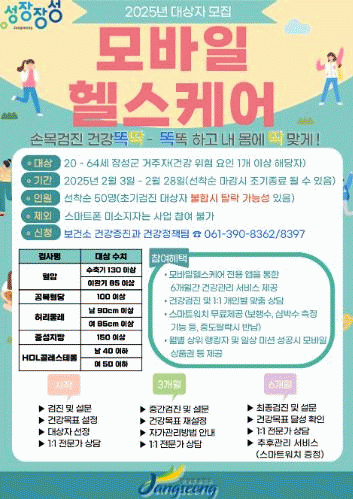 대상은 20세에서 64세 사이의 장성군민으로 △혈압 △공복혈당 △허리둘레 △중성지방 수치 △HDL(에이치디엘) 콜레스테롤 수치 가운데 1개 이상 건강위험요인을 가진 주민이다.