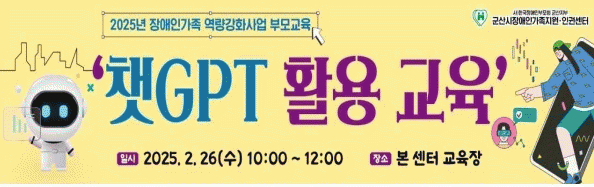 ‘챗GPT 활용 교육’은 26일 오전 10시부터 두 시간 동안 군산시장애인가족지원인권센터 교육장에서 무료로 진행된다.