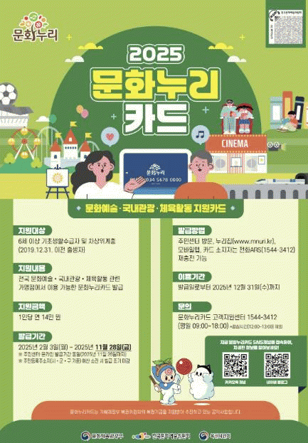 카드 발급 기간은 2월 3일부터 11월 28일까지이며 가까운 읍·면사무소 총무팀, 문화누리카드 누리집, 모바일앱 등을 통해 신청할 수 있다.