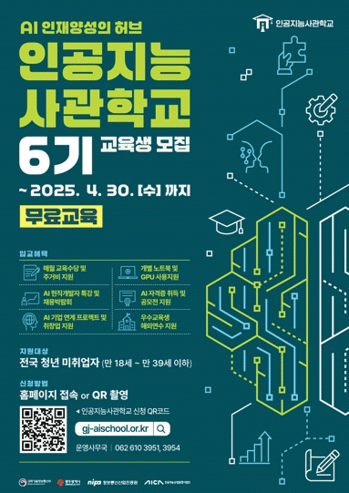 6기 교육생은 AI 사관학교 누리집을 통해 오는 4월30일까지 모집한다. 학력·전공·성적·거주지 등에 상관없이 인공지능(AI)에 관심 있는 만 18세에서 39세 사이의 전국 청년 미취업자 누구나 신청할 수 있다.