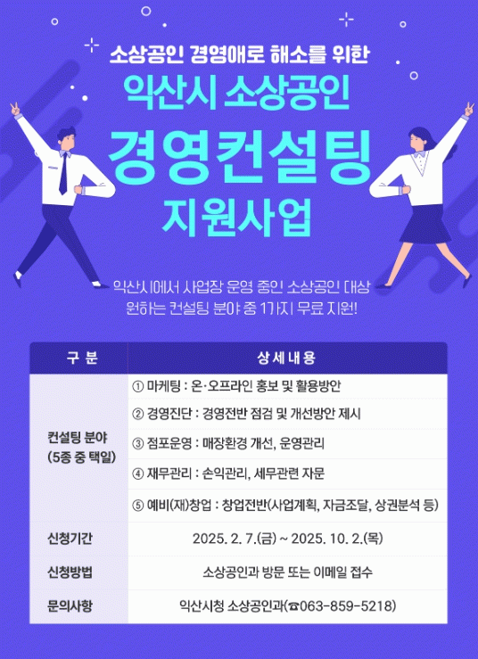 더욱 자세한 내용은 익산시 누리집 내 소상공인 지원사업 게시판을 참고하거나 소상공인과로 문의하면 된다.
