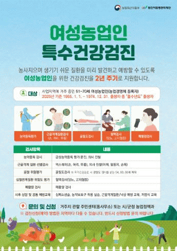 여성농업인 특수건강검진은 일반건강검진과 달리, 여성농업인이 취약한 질환을 조기에 발견하고 예방할 수 있도록 마련됐다.