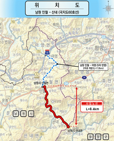 이 중 인월~산내 국지도60호선은 지리산권으로 가는 진출입 노선이자 경상남도와의 연결도로로 계절별 차량 정체 및 교통 혼잡이 빈번한 도로이다. 시설개량을 통해 인근 주민은 물론 동부 산악권 방문객에 원활한 교통환경을 제공하여 편안하고 안전한 지리산권 관광을 누릴 수 있게 할 예정이다.
