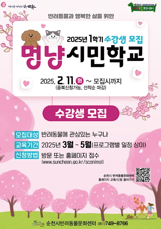 강좌 신청은 오는 11일부터 ‘순천시 반려동물문화센터 누리집과 반려동물문화센터 방문을 통해 선착순으로 받는다.