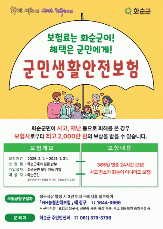 군민생활안전보험은 화순군에 주민등록을 둔 군민(등록외국인 포함)을 대상으로 별도 가입 절차는 없으며, 보험기간 중 보험금 지급 사유 발생 시 혜택받을 수 있다. 사고 발생 지역은 국내·국외 지구촌 어디든지 해당하고, 타 보험에 가입돼 있어도 중복보장이 가능하다.