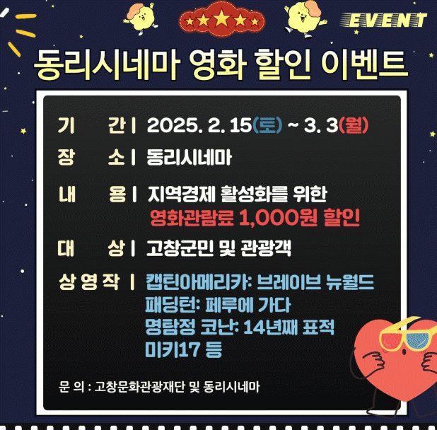 조창환 고창문화관광재단 상임이사는 “고창군 내수경기 활성화를 위해 영화관 할인 이벤트를 마련했다.”며, “고창군민과 관광객 모두가 동리시네마에서 문화 향유를 할 수 있길 바란다.”고 밝혔다.