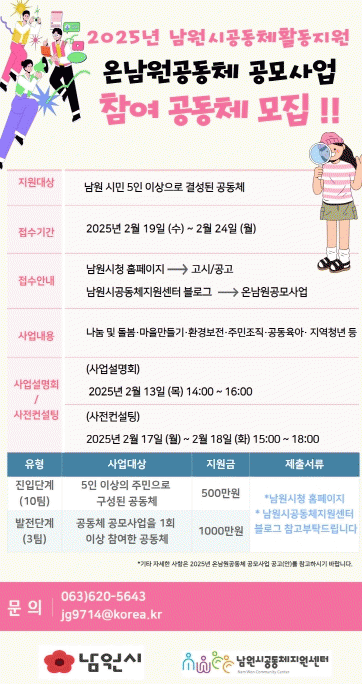 접수 기간은 2월 19일부터 2월 24일까지이며 남원시공동체지원센터에 직접 방문하거나 전자우편으로 신청할 수 있다.