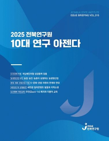 전북연구원은 12일 이슈브리핑(315호)을 통해 ‘함께 혁신, 함께 성공, 새로운 전북’의 비전과 ▲도민경제 부흥 ▲농생명산업 수도 ▲문화·체육·관광거점 조성 ▲새만금도약·균형발전 ▲도민행복·희망교육 등 도정 5대 목표를 뒷받침하기 위해 연구원 역량을 집중하기 위한 10대 연구아젠다를 선정했다고 발표했다.