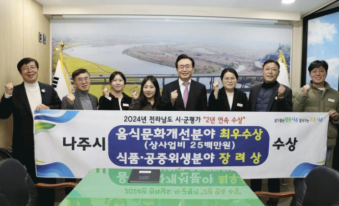 나주시는 음식문화개선을 위해 발굴한 정책 추진 성과에 힘입어 2023년 장려상에 이어 2024년 전라남도 음식문화개선 업무 실적 평가에서 최우수상을 수상하며 총 상사업비 3500만원을 확보하는 결실을 이뤘다.