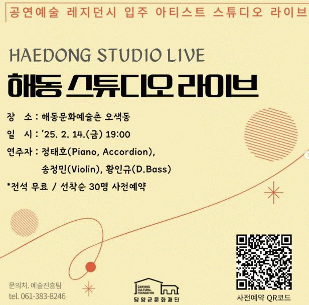 재단 관계자는 “해동 스튜디오 라이브는 녹음과 공연을 동시에 진행하는 실험적인 방식의 무대”라고 말하며, “아티스트와 관객이 작품의 제작 과정, 창작 의도 등을 색다른 방식으로 공유하게 되길 바란다.”라고 밝혔다.