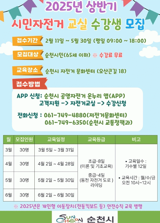 수강신청은 순천시 자전거문화센터로 전화(061-749-4880) 또는 순천시 공영자전거 온누리 앱(APP)을 통해 신청할 수 있다.