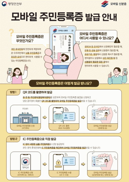 발급 방식은 IC주민등록증과 QR코드 중 선택할 수 있으며, 신청자는 본인 명의의 휴대전화에 ‘대한민국 모바일 신분증’ 앱을 설치해야 한다.