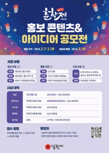 이번 공모전은 오는 28일까지 진행되며 입상자에게는 총 1000만원 상당의 상금과 남원시장상, 남원춘향제전위원장상이 수여된다.