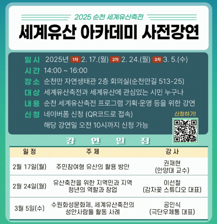 강연과 2025년 순천 세계유산축전에 대한 자세한 사항은 순천시청 국가유산과로 문의하면 된다.